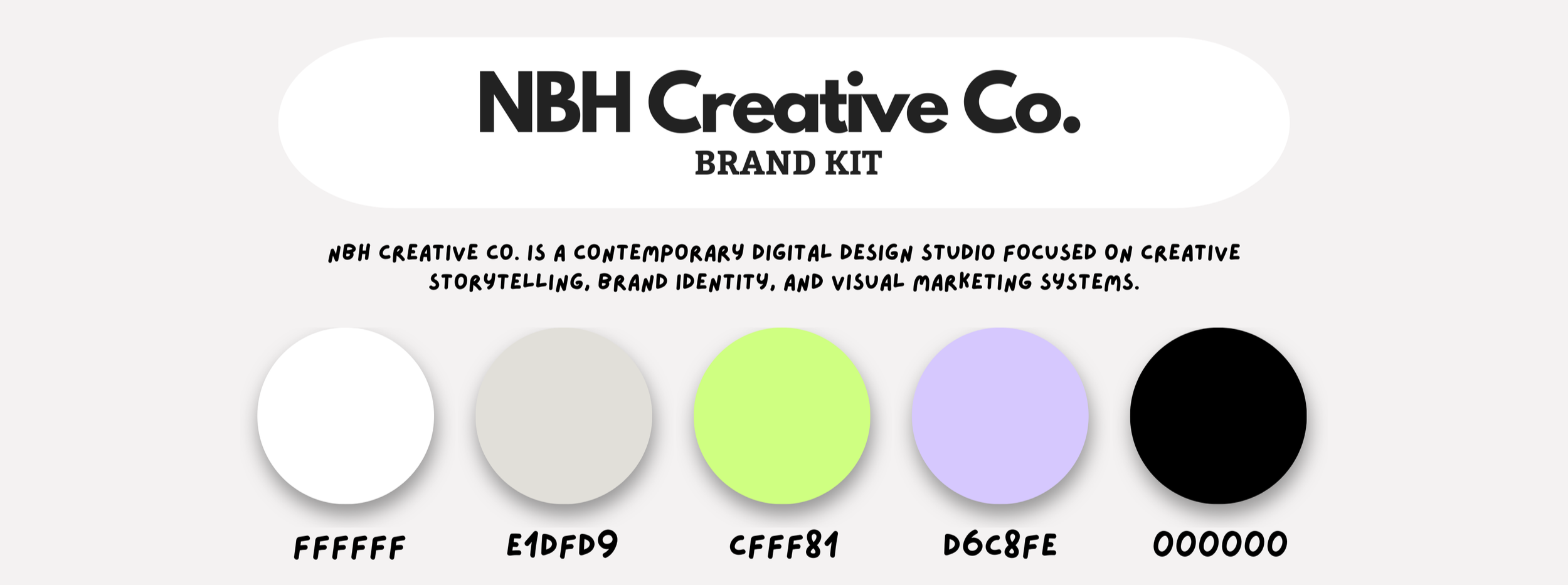 This brand kit establishes the visual foundation for NBH Creative Co., defining the color palette, typography system, logo styling, and interface elements used throughout the portfolio and digital media.